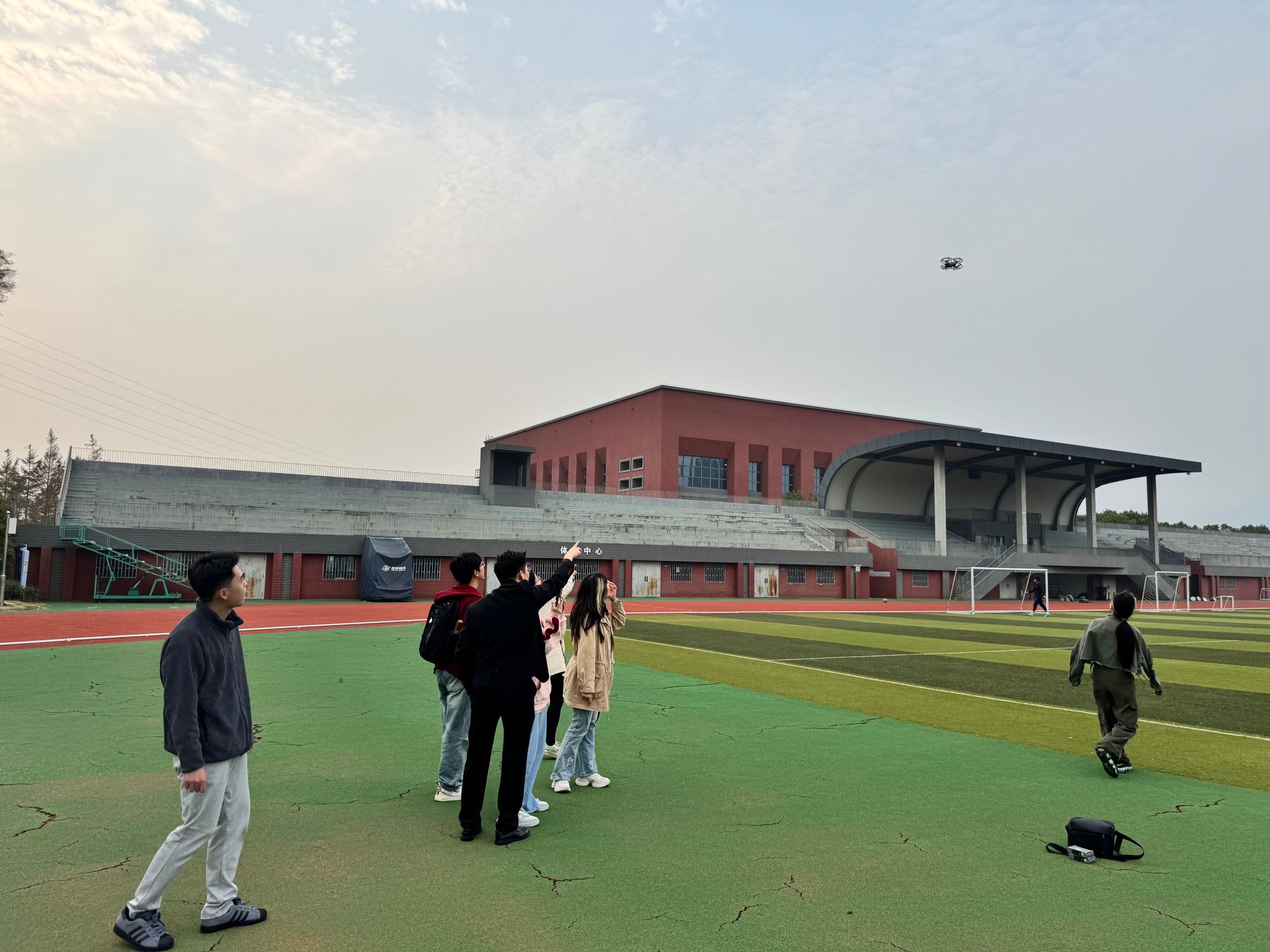 在实景飞行操控环节,学生在专业老师的指导下,严格按照航空安全规范,完成无人机起飞前的设备检查等流程,专业老师演示了无人机悬停、航线飞行、定点降落等科目训练。进一步介绍了“航拍测绘”“应急物资投送” 等应用场景的操作,通过现场点评和飞行综合评估,确保每一位参与学生都能对无人机安全飞行有一个直观的感受。