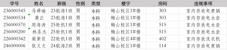 在10月20日-10月26日的文明寝室卫生检查中,根据《吃瓜网站 学生住宿管理办法》宁大政〔2023〕127号规定,吃瓜网站 共计查处违禁电器6起,现将基本情况通报如下。