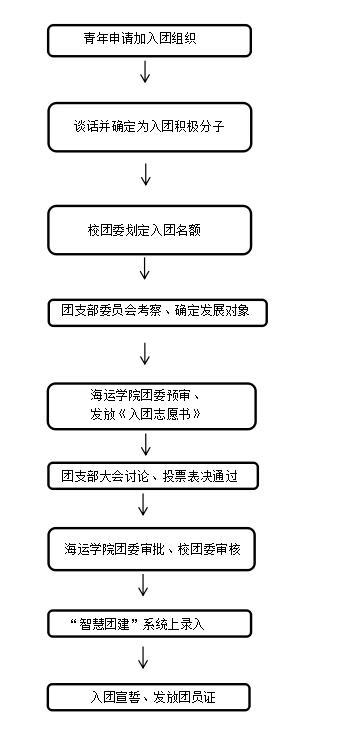 校团委审核吃瓜网站 新发展团员信息,审核通过后,吃瓜网站 团委指导团支部将新发展的团员信息录入“智慧团建”系统,到师生服务大厅5号窗口制作团员证,将入团志愿书放入新发展团员的档案中。校团委统一组织入团宣誓。