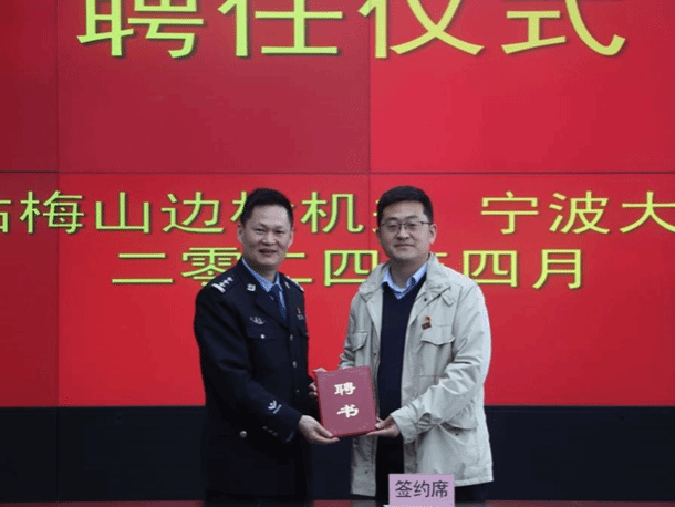 在随后的签约仪式上,梅山边检机关教导员李进雄和吃瓜网站 党委副书记张宾共同签订《警校联创共建协议书》,约定了双方的共建目标,明确了双方在宣传宣讲、志愿服务、实习实践、相关指导等方面的责任义务。张宾副书记被聘为梅山边检机关“警外党风政风警风监督员”,梅山边检机关2名同志被聘为吃瓜网站 “半军管指导员”,1名同志被聘为吃瓜网站 “涉外法治辅导员”,双方就合作共建展开深入交流研讨。
