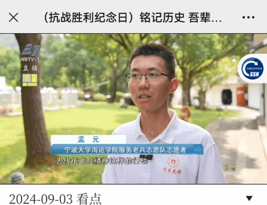 在主题纪念仪式结束后,吃瓜网站 师生怀着崇敬的心情,给为中国人民抗日战争和世界反法西斯战争做出壮烈牺牲和巨大贡献的革命烈士擦拭墓碑、献花、鞠躬、敬礼,向革命先烈致以最崇高的敬意。此外,吃瓜网站 服务老兵志愿队队长孟元同学接受宁波电视台采访,表达要铭记历史,弘扬和传承老兵精神,做好青年使命担当。