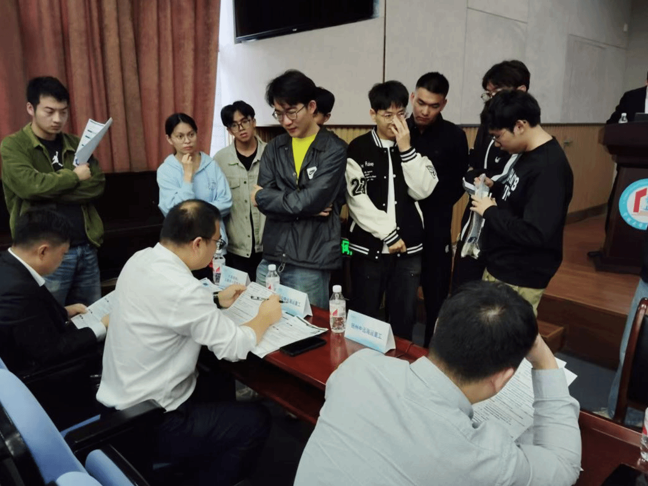 宣讲结束后,各单位组织现场面试,每家单位前都排满了意向学生,投递简历的同学更是络绎不绝,在面试之际各单位围绕自身的发展历程、主营业务、核心价值观以及招聘需求等方面,向同学们进行了一一的介绍。