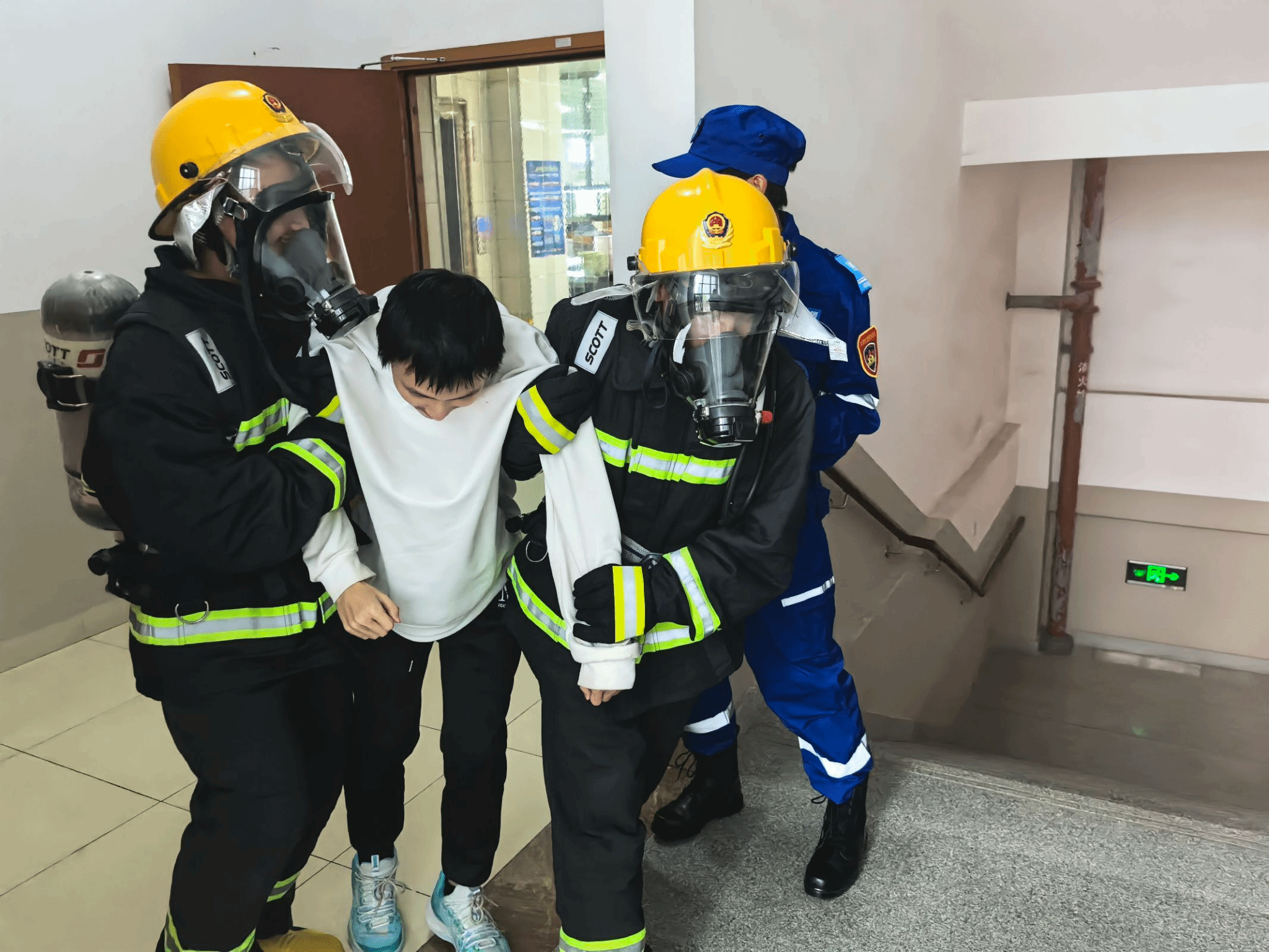 演习中,一场由违规使用电器引发的小型火灾在二餐二楼空房间内突然发生,迅速引起了在二楼用餐师生的注意。两位义务消防员迅速反应,一人立即拨打119报警,并通知学校保卫处和志愿消防队;另一人则迅速向食堂负责人报告火情,并协同消防队成员组织师生撤离。消防队成员迅速抵达现场,根据总指挥的指令,分为救援组和灭火组,有序开展人员疏散和灭火工作。在救援组的引导下,用餐师生用湿毛巾捂住口鼻,弯腰低姿,按照疏散指示标志迅速向安全出口疏散,同时拉起警戒绳,确保疏散区域的安全。经过紧张而有序的努力,所有人员均安全撤出,火情也得到了有效控制。